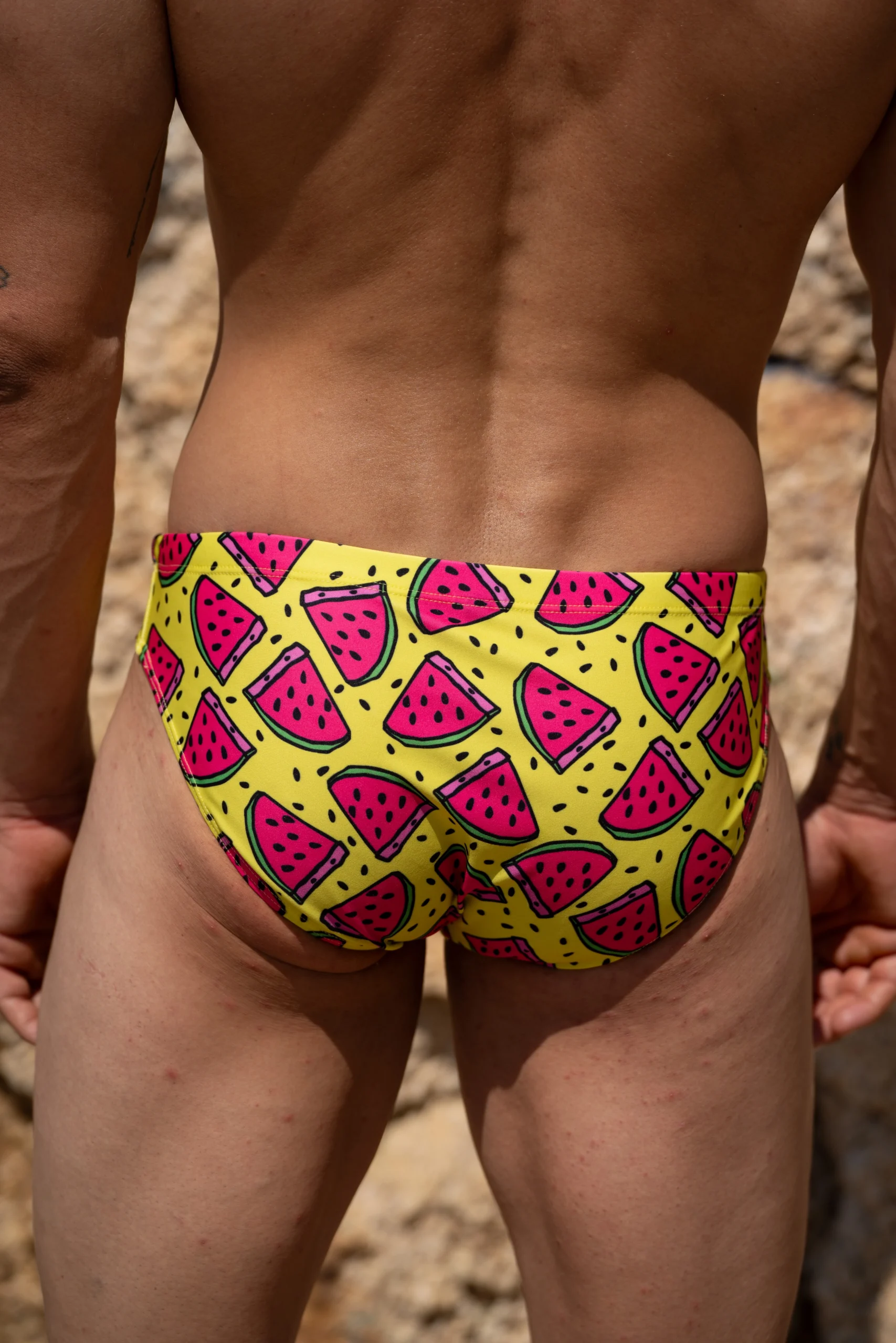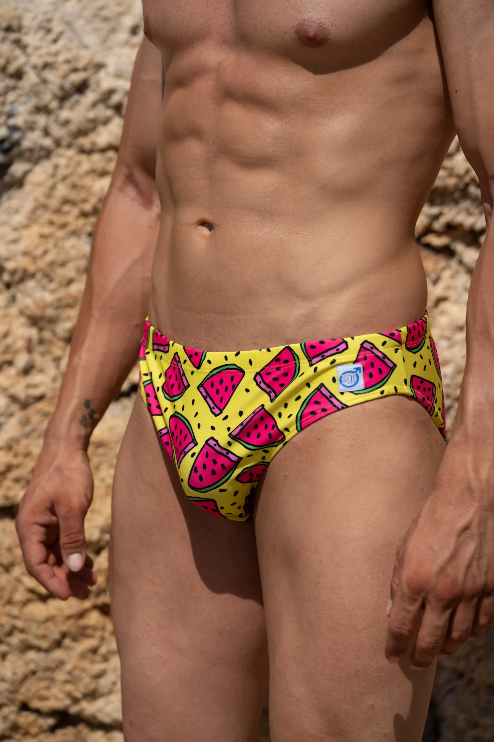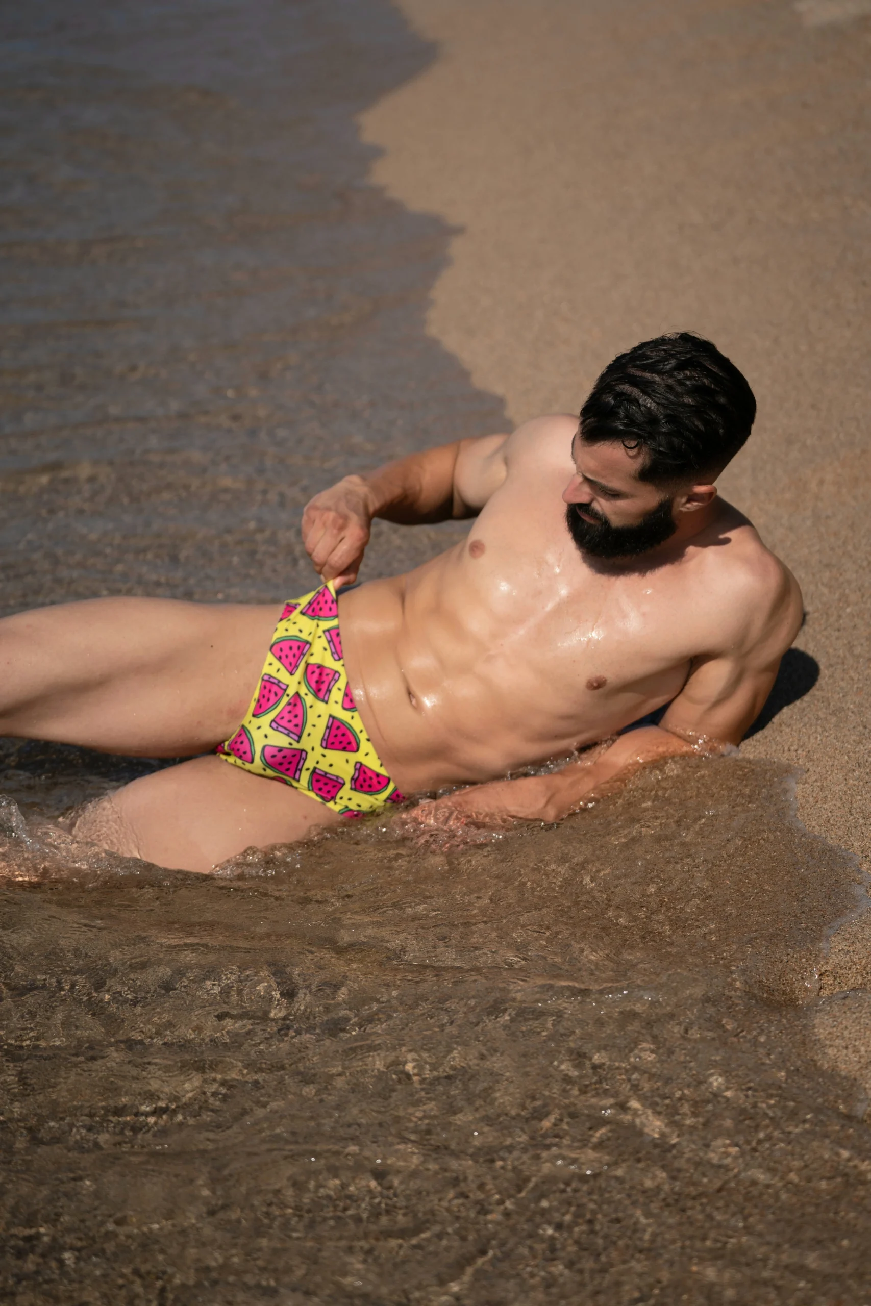 Fresh” es nuestro diseño mas vibrante y llamativo, diseñado para quienes buscan destacar en la playa o la piscina. Este modelo, confeccionado en un tejido de alta calidad, presenta un color amarillo intenso que evoca la energía del verano y el sol. Como elemento distintivo, nuestro bañador cuenta con un divertido estampado de sandías repartido por toda la prenda, aportando un toque fresco y juvenil.